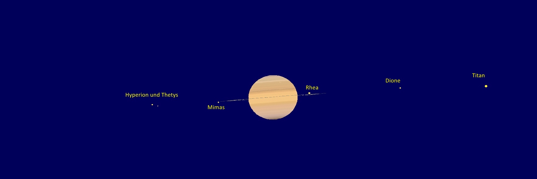 Wer ein Teleskop hat, sollte auch einen Blick auf den Saturn werfen: Noch sind die Ringe sehr schmal, einfach nur „Striche“. Die Monde des Saturn stehen „in eine Reihe“, ähnlich wie wir das vom Jupiter kennen. Das ist nur bei der Kantenstellung der Ringe zu beobachten.
