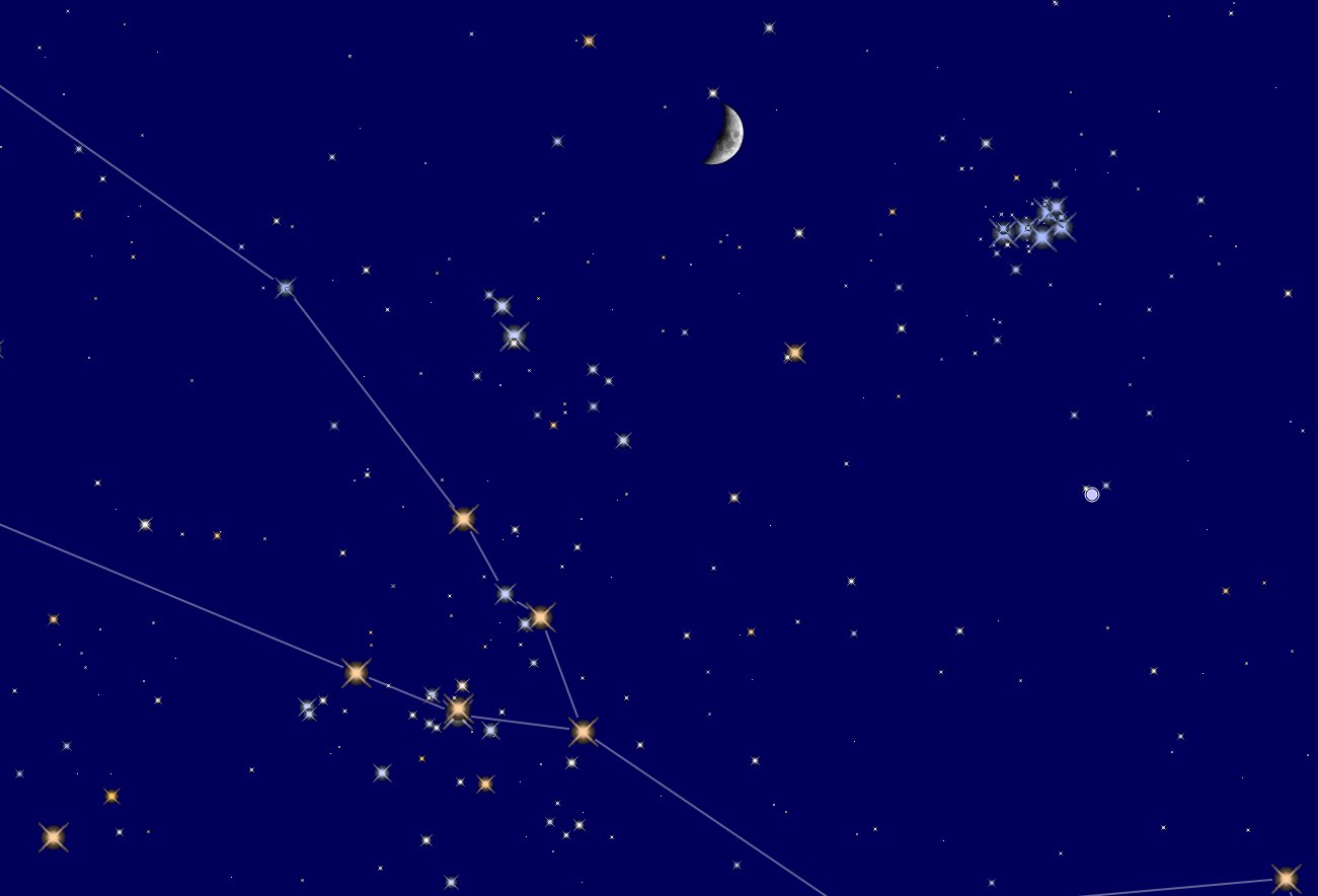Dieses Mal haben wir eine schöne Konstellation, der Mond steht zwischen den beiden Offenen Sternhaufen. Die noch recht schmale Mondsichel überstrahlt die beiden Sternhaufen nur wenig. Außerdem steht das Szenario bei Eintritt der Nacht hoch am Südwesthimmel.