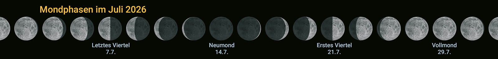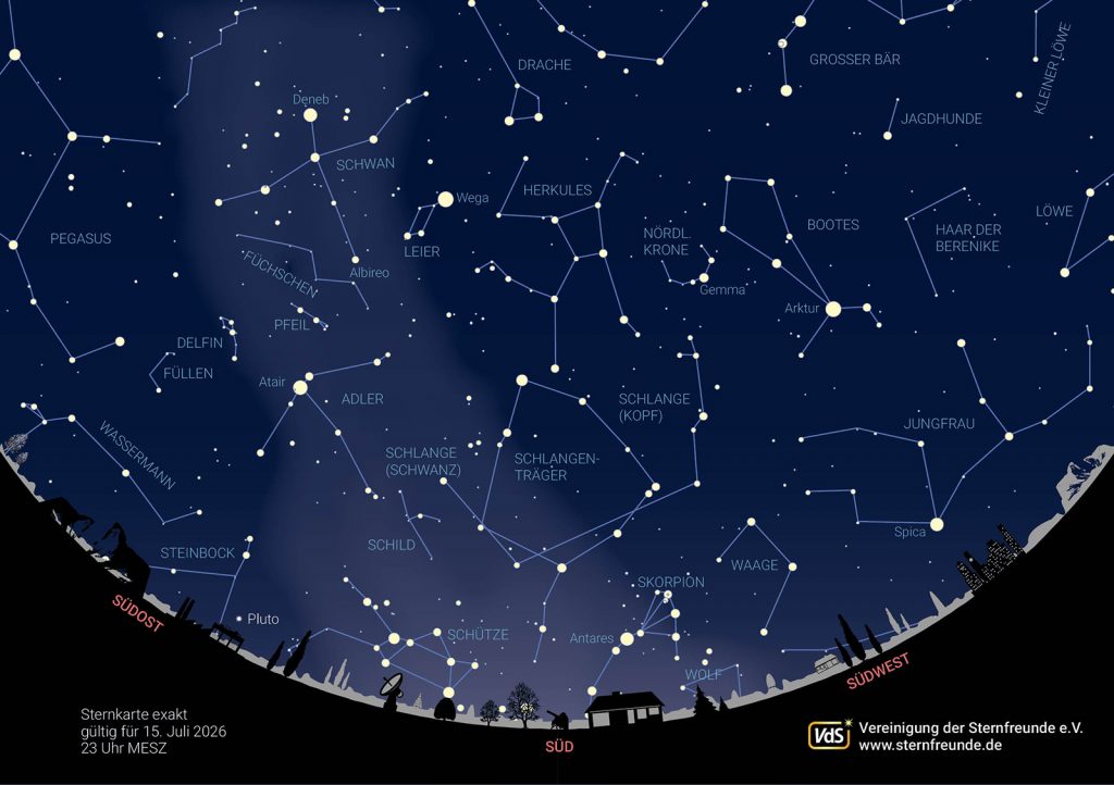 Der Juli ist der beste Monat, um die südlichen Sternbilder Skorpion und Schütze zu beobachten. Von Deutschland aus sind sie sehr nah am Horizont zu finden. Wer jedoch in der Mittelmeerregion Urlaub macht, kann sie deutlich höher am Himmel sehen. Oberhalb von Skorpion und Schütze verbergen sich die unscheinbaren Sternbilder Schlangenträger, Schlange und darüber der Herkules. Die besonders hellen Sterne am Himmel sind Arktur im Bootes, Wega in der Leier, Deneb im Schwan und Atair im Adler.