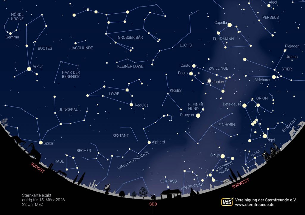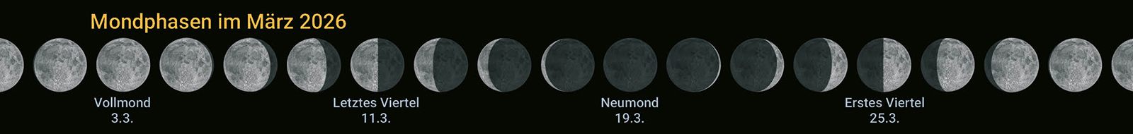 Der Sternenhimmel im März bildet den Übergang von den Winter- zu den Frühlingssternbildern. Abends kann man sich noch an den funkelnden Sternen von Orion, Großer Hund, Kleiner Hund, Zwillinge, Fuhrmann und Stier erfreuen. Um Mitternacht haben sie dann den Frühlingssternbildern rund um den Löwen Platz gemacht. Zwischen den Zwillingen und dem Löwen fällt das Tierkreissternbild Krebs kaum auf. Bei klarem Himmel und fernab störender Lichter wird man mitten im Krebs einen Nebelfleck entdecken: den offenen Sternhaufen Praesepe, die Krippe. Steil über uns findet man jetzt den Großen Bären, dessen sieben hellste Sterne die bekannte Figur des Großen Wagens bilden.
