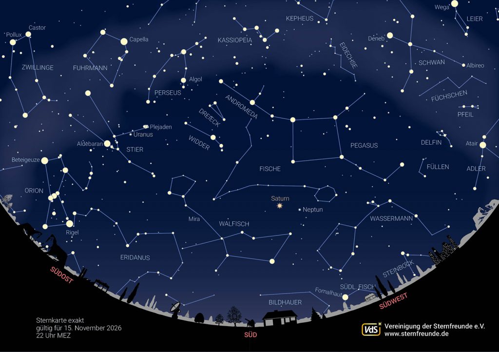 Saturn und Neptun im Grenzgebiet der Sternbilder Walfisch und Fische haben um 22 Uhr gerade den Meridian überquert. Hoch im Südosten lädt Uranus im Stier zu einer Beobachtung ein.