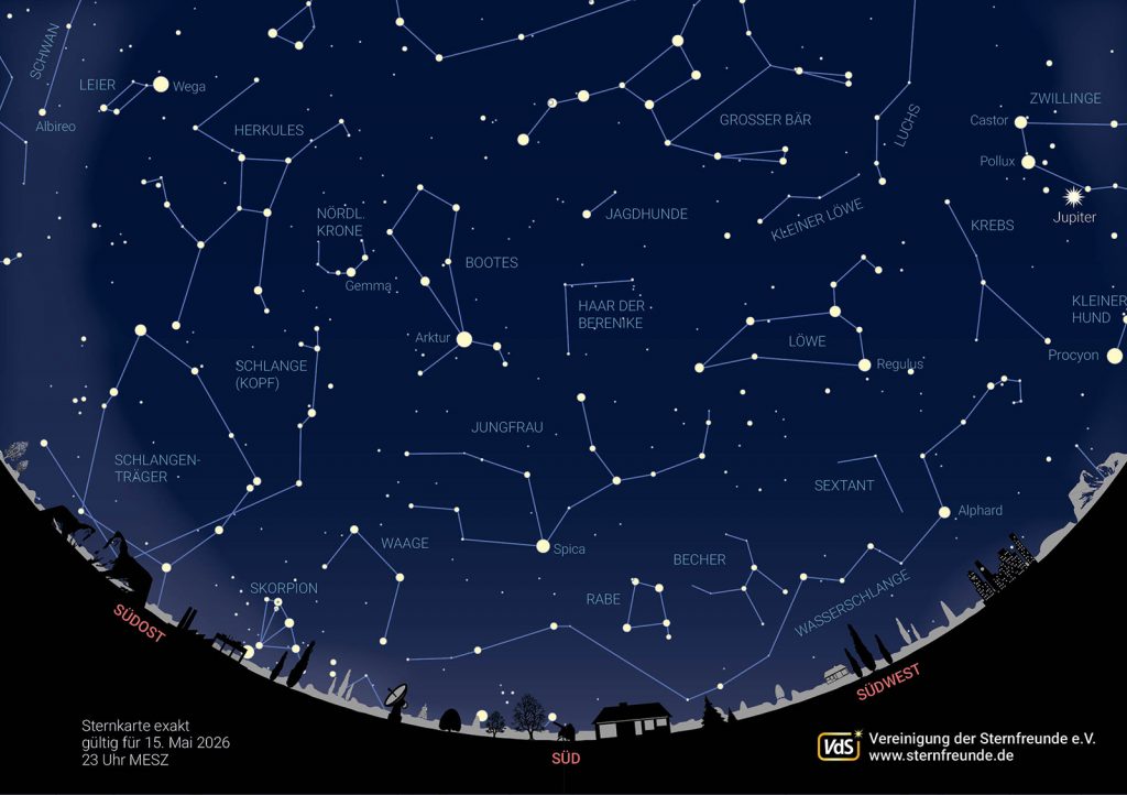 Sobald es abends dunkel wird, findet man das Sternbild Jungfrau über dem Südhorizont. Ihr hellster Stern trägt den Namen Spica. Ein Stück weiter oben am Himmel funkelt Arktur, der hellste Stern im Sternbild Bootes, dem Rinderhirten. In südwestlicher Himmelsrichtung fällt Regulus im Löwen auf. Die drei Sterne Spica, Arktur und Regulus bilden zusammen das sogenannte Frühlingsdreieck. Etwas oberhalb des Frühlingsdreiecks findet man das blasse Sternbild Haar der Berenike. Zum Südosthorizont hin kündigt sich der Übergang vom Frühlings- zum Sommersternhimmel an. Knapp über dem südöstlichen Horizont geht der Skorpion auf.