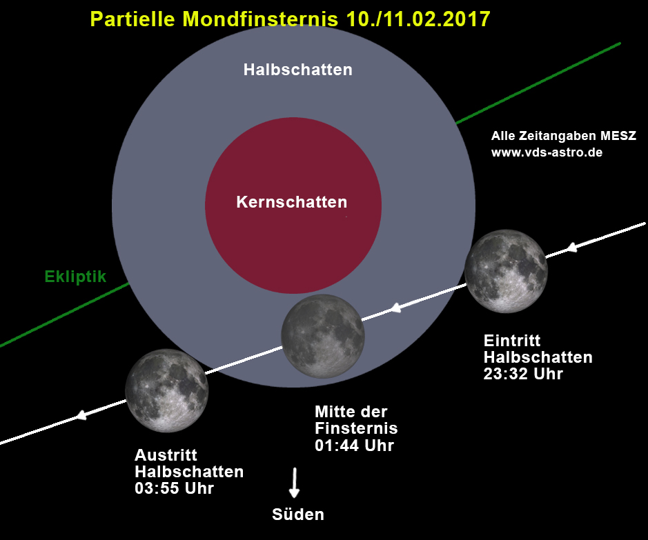 in der Nacht vom 10. auf den 11. Februar läuft der Mond durch den Halbschatten der Erde. Der Mond dringt an diesem Tag vollständig in den Halbschatten ein, den Kernschatten berührt der Mond dieses Mal aber nicht. Dennoch lohnt sich – einen klaren Himmel vorausgesetzt durchaus ein Blick auf den Erdtrabanten im ungewohnten Licht. Extra aufstehen oder wachbleiben muss man wegen einer Halbschattenfinsternis aber nicht unbedingt.