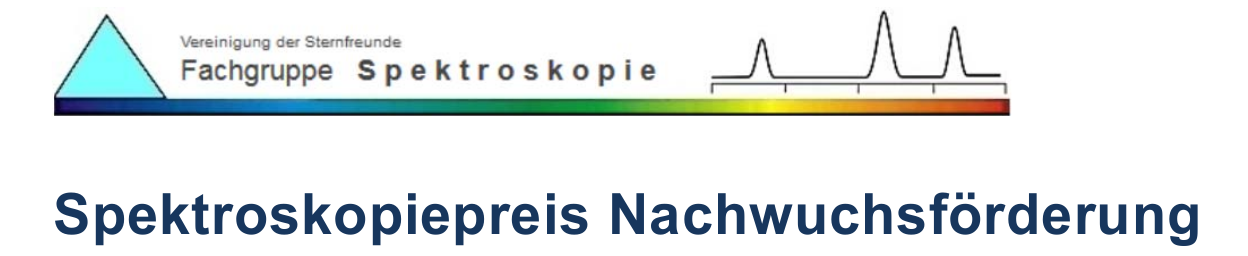 Die VdS-Fachgruppe Spektroskopie lobt einen jährlichen Förderpreis im Bereich Spektroskopie für Schülerinnen und Schüler aus. Der Preis beinhaltet ein Preisgeld von 1.500,00 EUR sowie einen Reisekostenzuschuss von bis und 500,00 EUR für die Reise zur Preisverleihung und ggf. für die Teilnahme an der Jahreskonferenz der Fachgruppe „Aspekt“ gemäß den Vergabebedingungen.