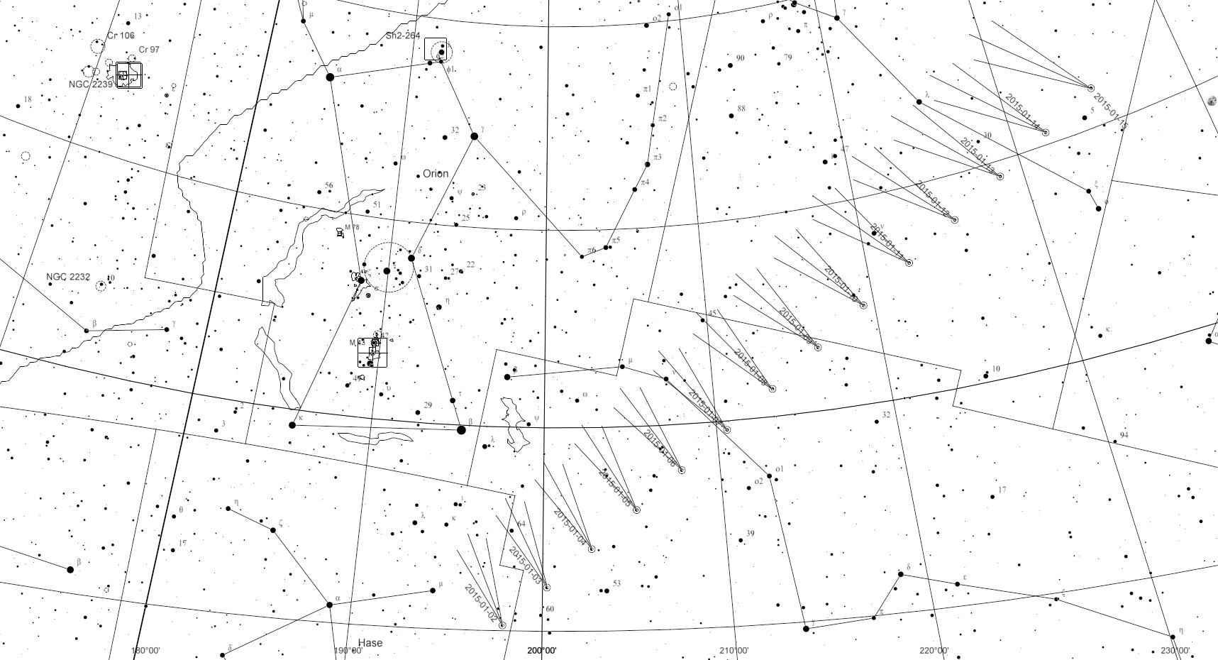 Jupiter dominiert um den Jahreswechsel 2014/2015 herum den Himmel, was die Helligkeit angeht. Die positive Überraschung ist aber der Komet Lovejoy, dessen Helligkeit es möglich macht ihn mit bloßem Auge am Himmel auszumachen. Mehr zu sehen ist mit einem Fernglas. Ist der Himmel frei von Wolken, kann man mit Hilfe unserer Aufsuchkarten selbst einmal wagen, den Schweifstern zu beobachten.