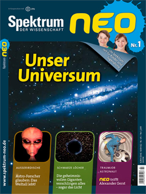 „Unser Universum“ – so heißt das erste Heft von „Spektrum neo“, dem Wissensmagazin für Kinder und Jugendliche. Und das sind: viele Bilder, spannende Geschichten, interessantes Wissen und ein Experiment zum Mitmachen. Die wichtigsten Themen: Außerirdische – Astroforscher glauben: Das Weltall lebt; Schwarze Löcher – Die geheimnisvollen Giganten verschlucken sogar das Licht; Traumjob Astronaut – neo trifft Alexander Gerst.